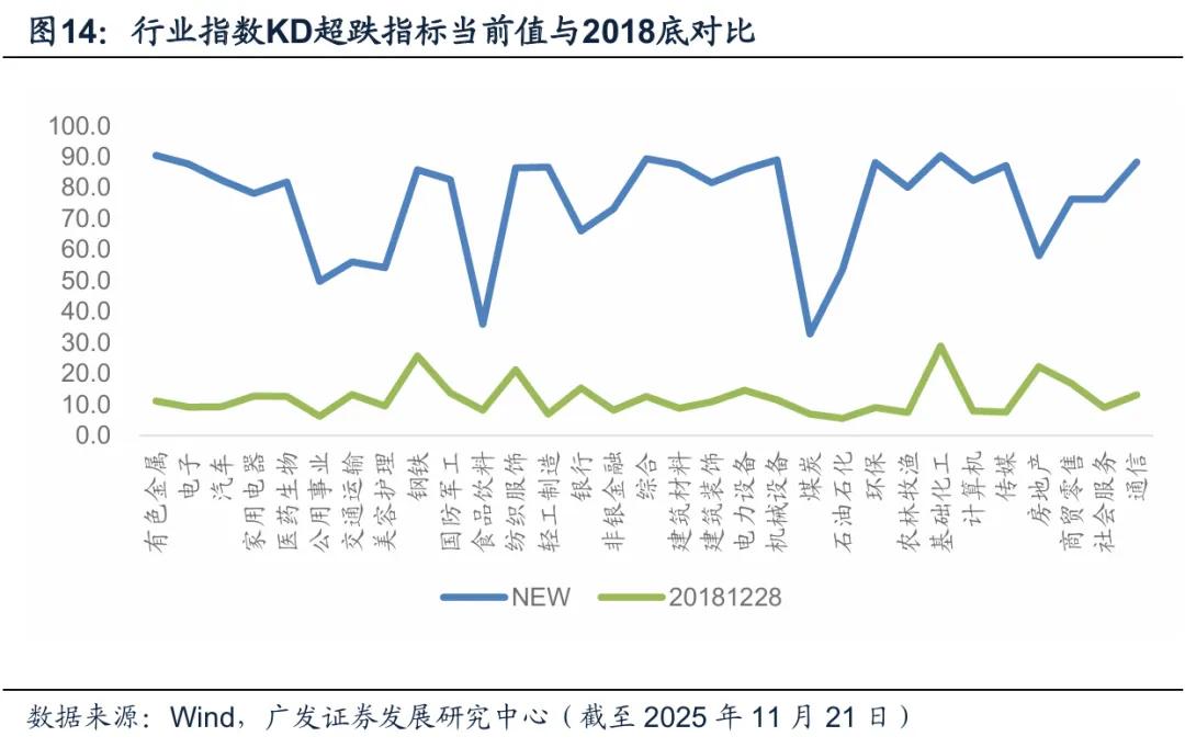 不同板块技术面超跌对比,从KD指标可以看市场与极端低位时点在内在结构上的差异。