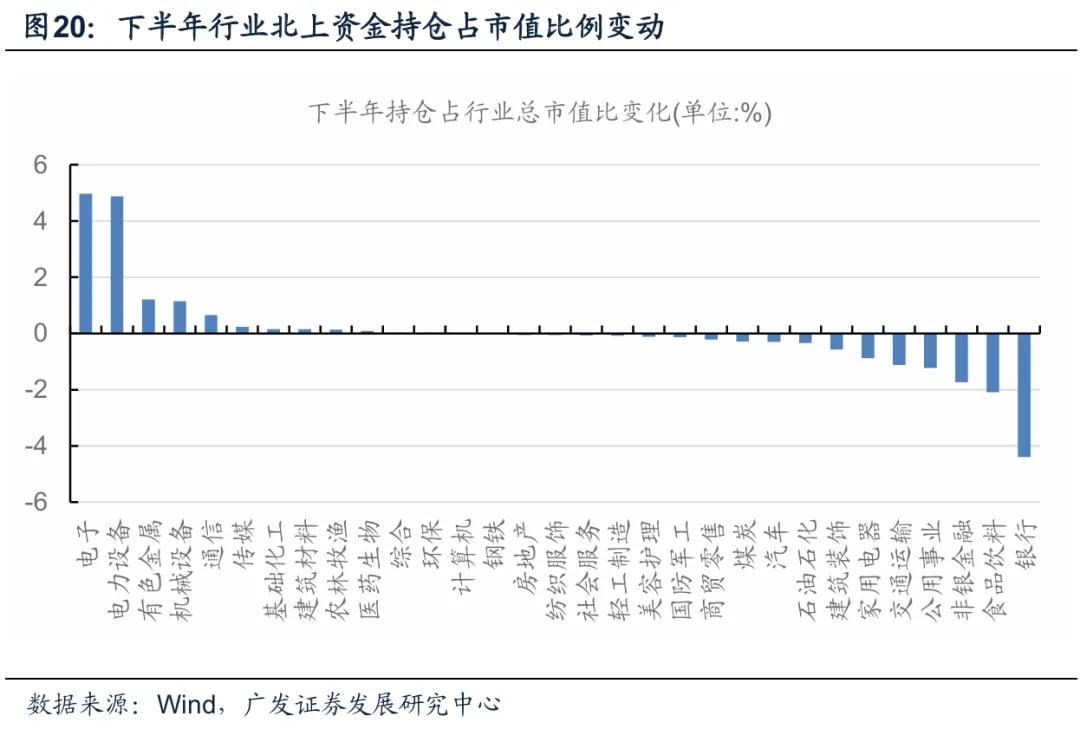 2025年下半年北上资金流入占比变化,靠前的行业分布为电子、电力设备、有色金属、机械设备、通信等行业。