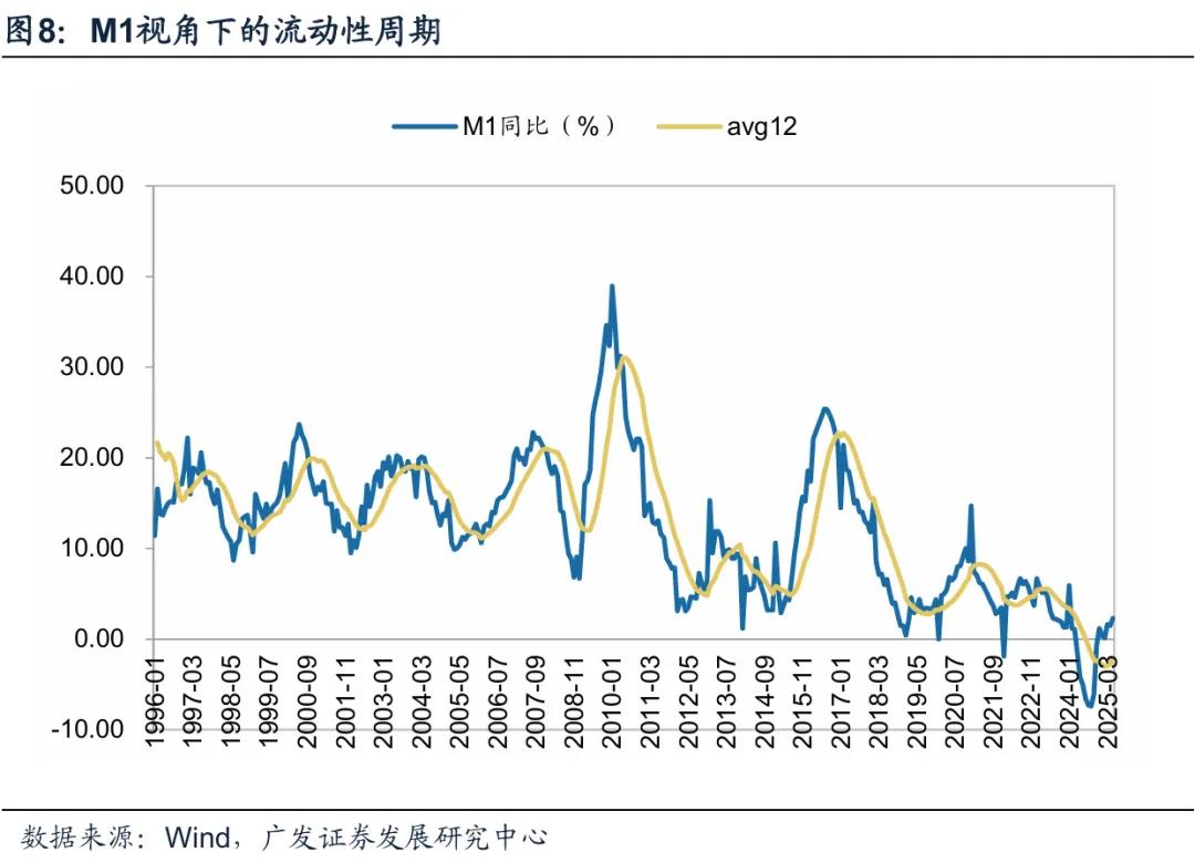 M1同比数据具有典型的周期性特征,2008年之前几乎为标准的正弦曲线,1998至2008,10年3轮周期,每轮40个月,上下行持续时间20个月,2015年至2019年周期同样符合20个月单边周期特征,2018下行周期与2019年开始的本轮上行周期分别对应权益市场熊市与牛市。