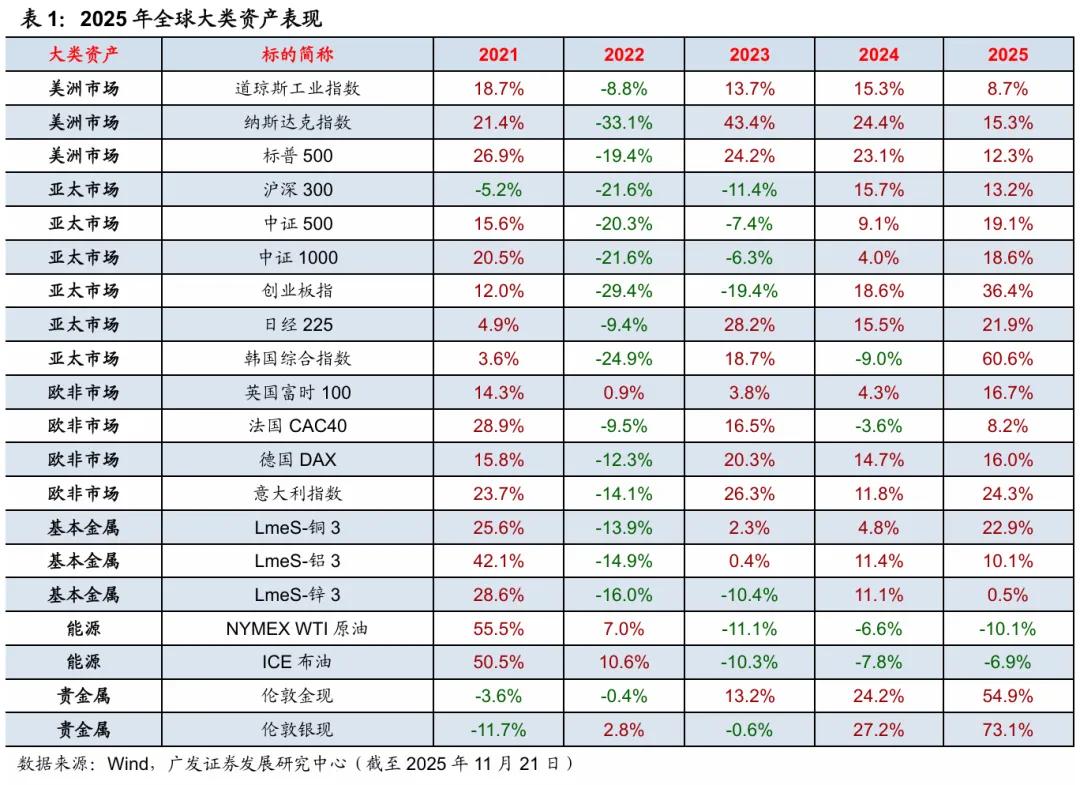 2025年全球大类资产总体涨幅明显,其中贵金属表现相对强势,权益市场方面,亚太市场整体表现更好。A股表现总体强势,4月初至8月底涨幅明显,9月以来呈现震荡行情,根据Wind,截至11月21日,创业板指今年以来上涨36.4%。